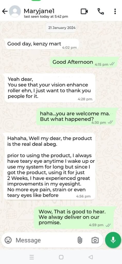 “I’ve been using the Vision Enhance Roller for a while now, and the results speak for themselves. I had an eye exam yesterday, and my doctor told me my eyes look fantastic. They even encouraged me to keep using whatever I’m using. This Vision Enhance Roller is definitely a game-changer for maintaining healthy eyes!” – Mrs. Roseya